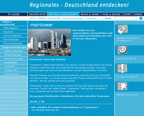 Maintower moderierte ich 8 Jahre lang von 2001 bis 2009 täglich jede zweite Woche im Wechsel mit Kirsten Rademacher.